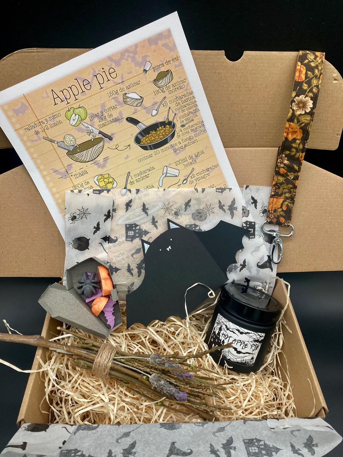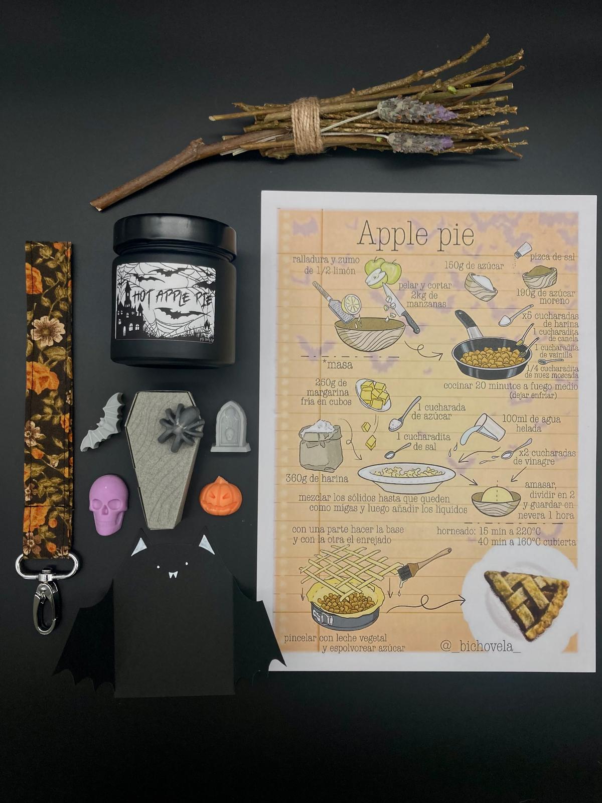 Lleva una vela grande con nuestro olor a tarta de manzana especiada, adornada con unos mini melts que os encantarán; una cajita-ataúd con melts de nuestro olor a manzana; un llavero con una tela muy otoñal; tampoco podía faltar una escribirá de bruja con olor a lavanda y como siempre una lámina que podéis coleccionar de la receta de tarta de manzana especiada.